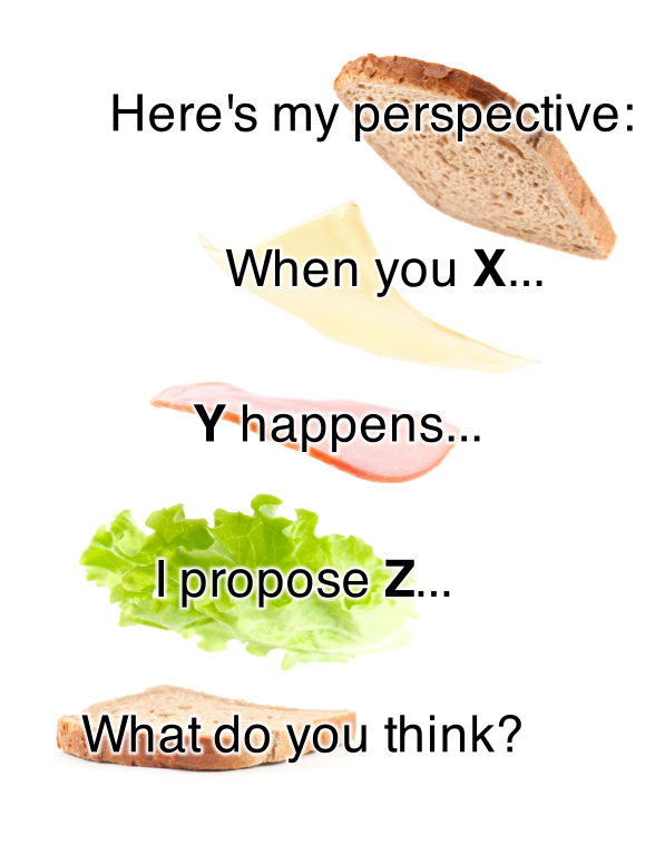 This way of telling something negative, avoids the feeling of the criticized person, that his work was bad, and allows to think of him/herself in a self reflecting way. Probably a better way to give feedback is the one on the second picture. In that case one doesn´t has to find frantic a positive statement, as one wants to tell the negative points, but to allow the opposite to give his/her opinion to the suggested and described situation in the view of the criticizer. If both sides are acting in a professional way, it will lead to an interesting conversation and to an exchange of possibilities and statements. So in that sense: