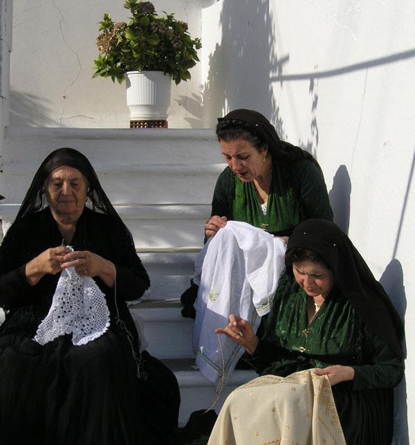 From Lefkada we could taste the typical dry salami. Through our brainstorming we learned about the different types of wine for instance Bertzamo or Bardeas. Also honey, Soumada, Pasteli, Madolato, pies, chocolate, Ladopita and the lentils were mentioned. Moreover the embroidery and the typical Karsaniko stitch from Karia are quite famous. Part of the tradition is also the Lefkadian clothes that are shown in the festival week in August with its special women´s bra, called “Steka” or “Camcetto”. We heard about Sirti fishing, which is a method that is not wide spread and a product called Avgotaraxo. This “fish egg pie”, somehow